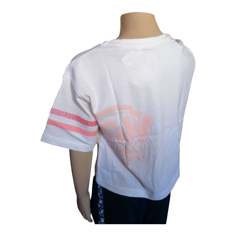 PAW Patrol Crop Top „Skye“: Weißes, bauchfreies T-Shirt mit Skye-Motiv und rosa Glitzer-Schriftzug, 100 % Baumwolle, Kurzarm & Rundhals – Größen 98–128.